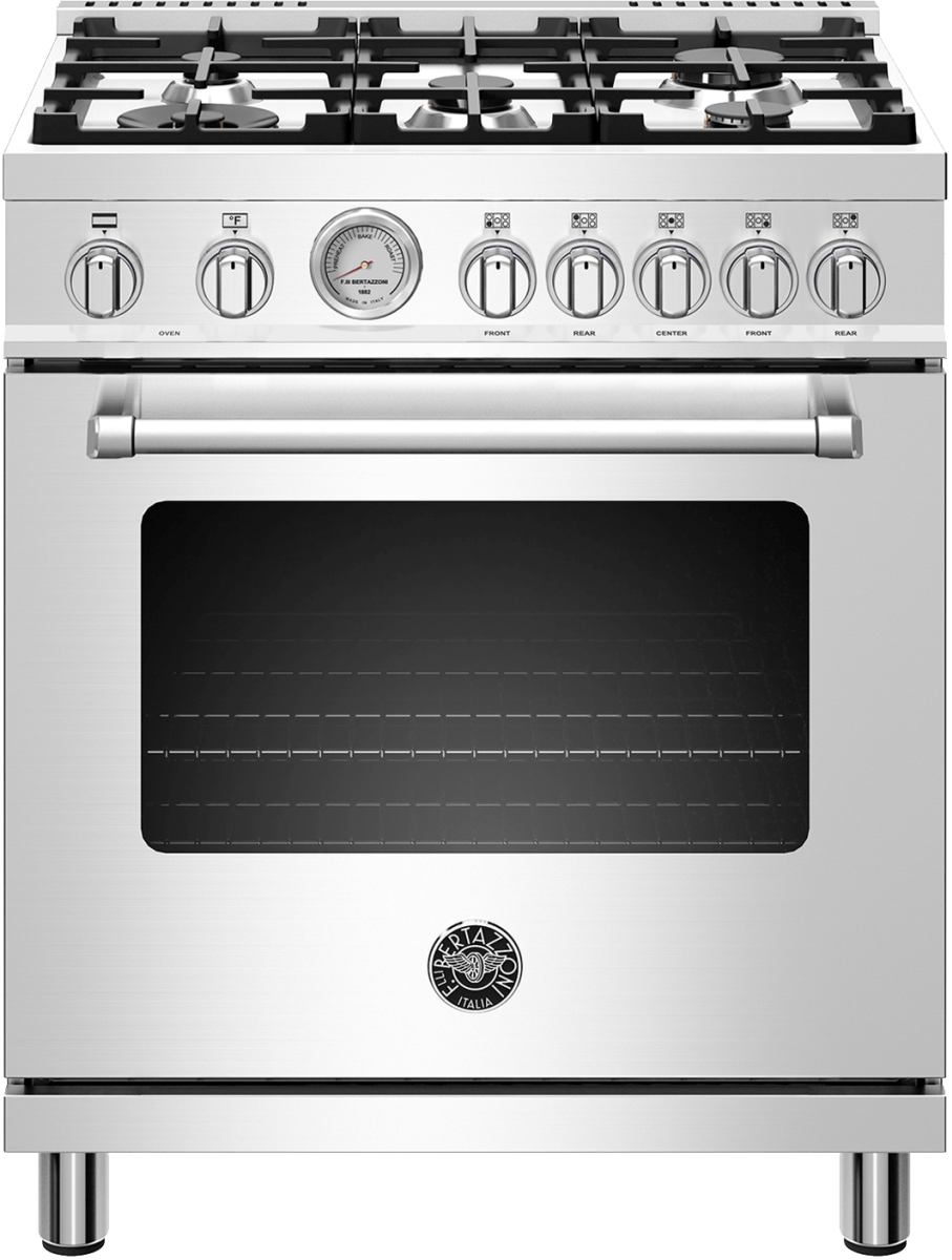 The new Bertazzoni ranges are superb cooking appliances designed, engineered and made in Italy. All Bertazzoni appliances integrate seamlessly into style-harmonized suites for a true, high-performing kitchen. The high-efficiency maintop with 5 burners features a dual ring 19,000 BTU power-burner that boils water in under 6 minutes (best in class), and 4 additional MonoBloc burners of variable size and power to suit every style of cooking, with delicate simmer at 750 BTUs. The 4.7 cubic feet oven cavity is the largest in its class, with dual convection fan for balanced airflow and even temperature baking and roasting on 7 shelf levels. The elegant large temperature gauge monitors the actual temperature in the oven. The extra wide electric broiler with optional convection is ideal for grilling and searing at high heat. The oven includes convenient soft-motion doors. The edge-to-edge interior oven glass door maximizes interior volume and can be wiped clean without effort. All Bertazzoni appliances are covered by a 2-year warranty. Products and packaging are 99% recyclable.