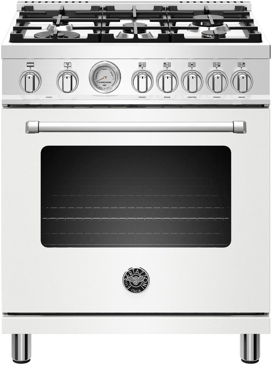 The new Bertazzoni ranges are superb cooking appliances designed, engineered and made in Italy. All Bertazzoni appliances integrate seamlessly into style-harmonized suites for a true, high-performing kitchen. The high-efficiency maintop with 5 burners features a dual ring 19,000 BTU power-burner that boils water in under 6 minutes (best in class), and 4 additional MonoBloc burners of variable size and power to suit every style of cooking, with delicate simmer at 750 BTUs. The 4.7 cubic feet oven cavity is the largest in its class, with dual convection fan for balanced airflow and even temperature baking and roasting on 7 shelf levels. The elegant large temperature gauge monitors the actual temperature in the oven. The extra wide electric broiler with optional convection is ideal for grilling and searing at high heat. The oven includes convenient soft-motion doors. The edge-to-edge interior oven glass door maximizes interior volume and can be wiped clean without effort. All Bertazzoni appliances are covered by a 2-year warranty. Products and packaging are 99% recyclable.