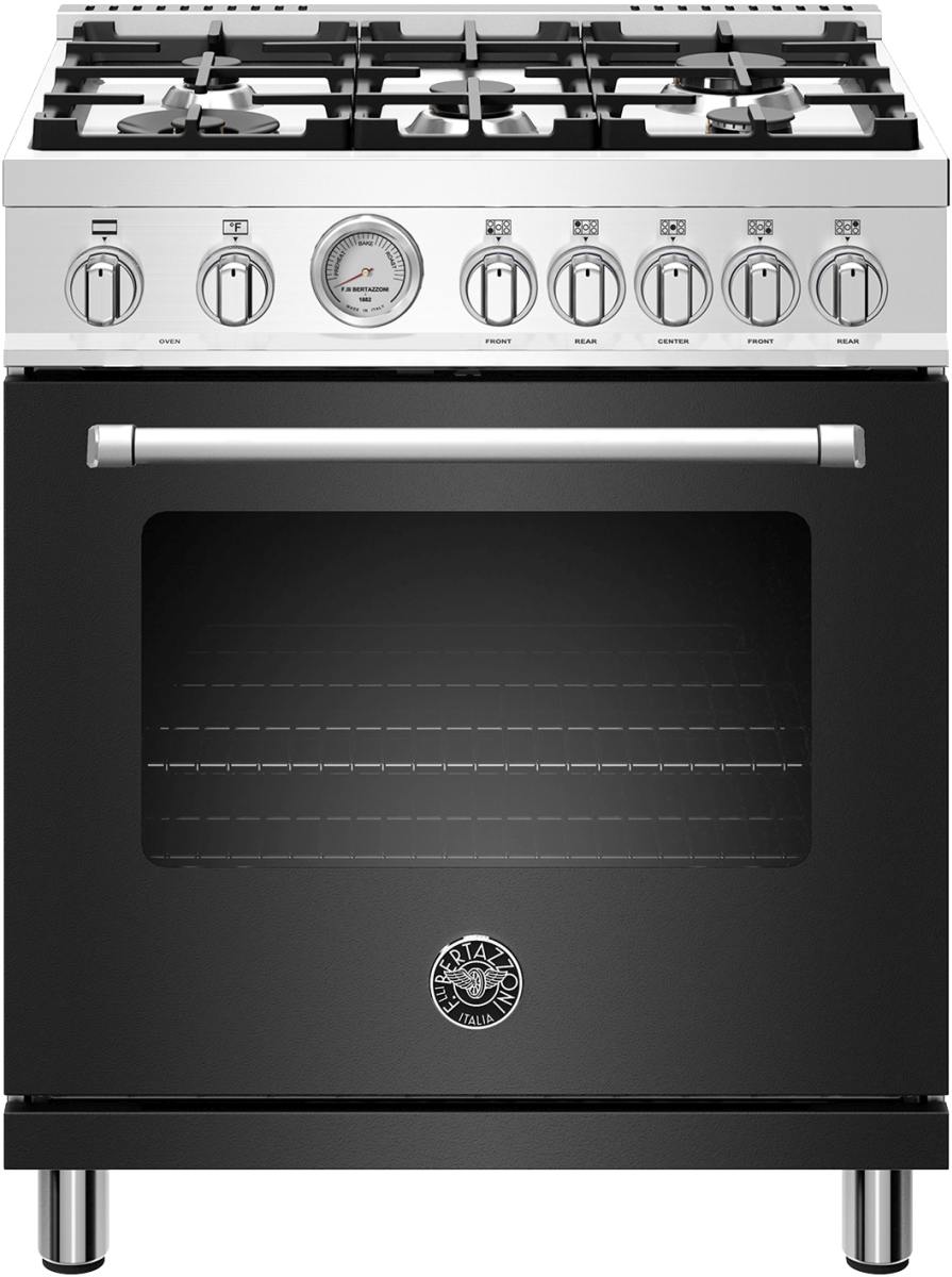 The new Bertazzoni ranges are superb cooking appliances designed, engineered and made in Italy. All Bertazzoni appliances integrate seamlessly into style-harmonized suites for a true, high-performing kitchen. The high-efficiency maintop with 5 burners features a dual ring 19,000 BTU power-burner that boils water in under 6 minutes (best in class), and 4 additional MonoBloc burners of variable size and power to suit every style of cooking, with delicate simmer at 750 BTUs. The 4.7 cubic feet oven cavity is the largest in its class, with dual convection fan for balanced airflow and even temperature baking and roasting on 7 shelf levels. The elegant large temperature gauge monitors the actual temperature in the oven. The extra wide electric broiler with optional convection is ideal for grilling and searing at high heat. The oven includes convenient soft-motion doors. The edge-to-edge interior oven glass door maximizes interior volume and can be wiped clean without effort. All Bertazzoni appliances are covered by a 2-year warranty. Products and packaging are 99% recyclable.