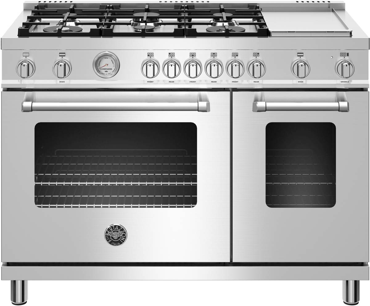 The new Bertazzoni ranges are superb cooking appliances designed, engineered and made in Italy. All Bertazzoni appliances integrate seamlessly into style-harmonized suites for a true, high-performing kitchen. The high-efficiency maintop with 6 burners and electric griddle features 2 dual ring 19,000 BTU power-burners that boil water in under 6 minutes (best in class), and 4 additional MonoBloc burners of variable size and power to suit every style of cooking, with delicate simmer at 750 BTUs. The stainless steel griddle with integrated cover provides additional cooking options. The 4.7 cubic feet oven is the largest in its class, with dual convection fan for balanced airflow and even temperature baking and roasting on 7 shelf levels. The elegant large temperature gauge monitors the actual temperature in the oven. The extra wide electric broiler with optional convection is ideal for grilling and searing at high heat. The 2.4 cubic feet auxiliary oven is perfect for smaller dishes and for warming. Both ovens include convenient soft-motion doors. The edge-to-edge interior oven glass door maximizes interior volume and can be wiped clean without effort. All Bertazzoni appliances are covered by a 2-year warranty. Products and packaging are 99% recyclable.