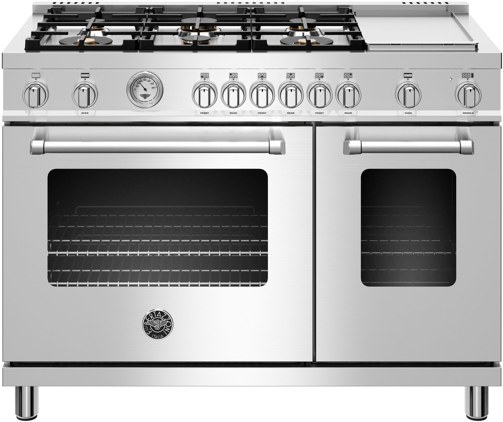 The high-efficiency maintop with 6 brass burners and electric griddle features 2 dual ring 19,000 BTU power-burners that boil water in under 6 minutes (best in class), and 4 additional MonoBloc burners of variable size and power to suit every style of cooking, with delicate simmer at 750 BTUs. The stainless steel griddle with integrated cover provides additional cooking options.