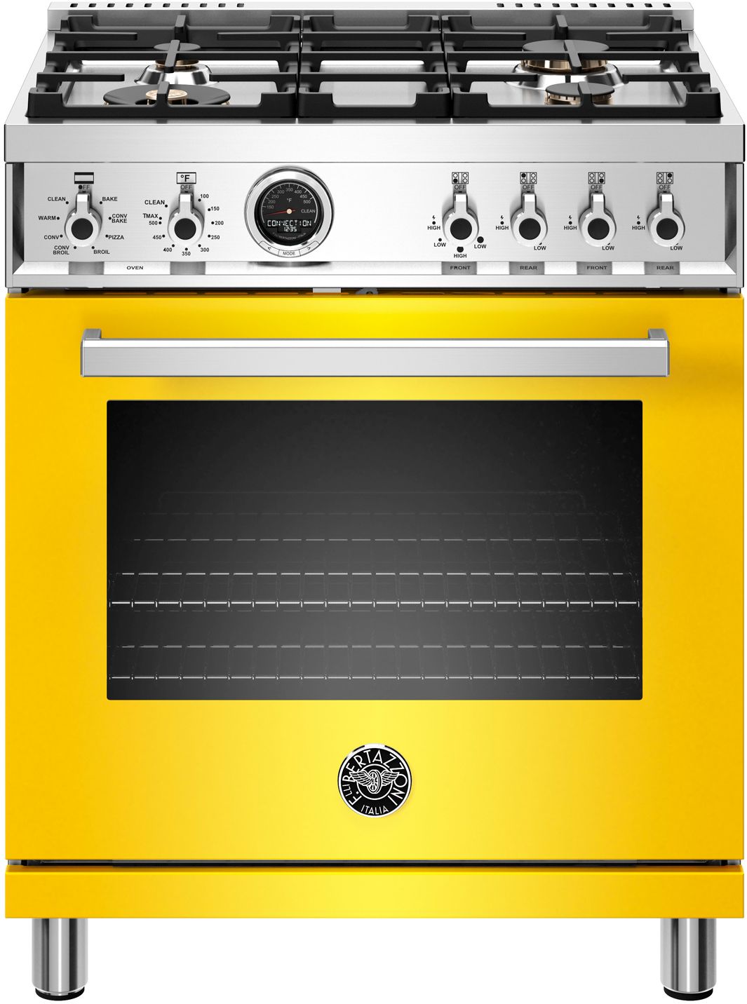 The new Bertazzoni ranges are superb cooking appliances designed, engineered and made in Italy. All Bertazzoni appliances integrate seamlessly into style-harmonized suites for a true, high-performing kitchen. The high-efficiency maintop with 4 brass burners features a dual ring 19,000 BTU power-burner that boils water in under 6 minutes (best in class), and 3 additional MonoBloc burners of variable size and power to suit every style of cooking, with delicate simmer at 750 BTUs. The 4.6 cubic feet oven cavity is the largest in its class, with dual convection fan for balanced airflow and even temperature baking and roasting on 7 shelf levels. The elegant digital temperature gauge monitors the actual temperature in the oven and has integrated controls in the bezel for the food temperature probe. The extra wide electric broiler with optional convection is ideal for grilling and searing at high heat. The oven includes convenient features such as smooth telescopic glides for the oven shelves and soft-close doors. The edge-to-edge interior oven glass door maximizes interior volume and can be wiped clean without effort. All Bertazzoni appliances are covered by a 2-year warranty. Products and packaging are 99% recyclable.