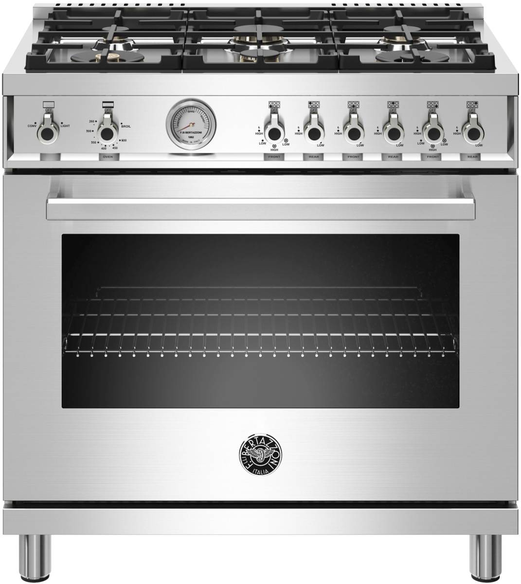 The new Bertazzoni ranges are superb cooking appliances designed, engineered and made in Italy. All Bertazzoni appliances integrate seamlessly into style-harmonized suites for a true, high-performing kitchen. The high-efficiency maintop with 6 brass burners features 2 dual ring 19,000 BTU power-burners that boil water in under 6 minutes (best in class), and 4 additional MonoBloc burners of variable size and power to suit every style of cooking, with delicate simmer at 750 BTUs. The 5.9 cubic feet oven cavity is the largest in its class, with dual convection fan for balanced airflow and even temperature baking and roasting on 7 shelf levels. The elegant large temperature gauge monitors the actual temperature in the oven. The extra wide infrared gas broiler is ideal for grilling and searing at high heat. The oven includes convenient features such as smooth telescopic glides for the oven shelves and soft-close doors. The edge-to-edge interior oven glass door maximizes interior volume and can be wiped clean without effort. All Bertazzoni appliances are covered by a 2-year warranty. Products and packaging are 99% recyclable.