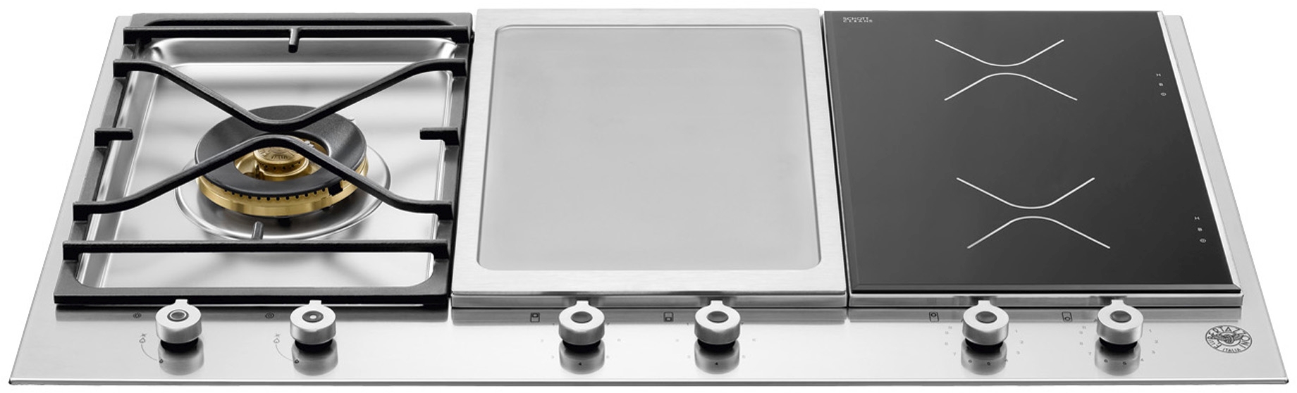 Bertazzoni rangetops and cooktops are superb cooking appliances designed, engineered and made in Italy. All Bertazzoni appliances integrate seamlessly into style-harmonized suites for a true, high-performing kitchen. Bertazzoni segmented cooktops offer different combinations of gas, griddle and induction cooking. Available segments are single gas power burner with dual ring and 18,000 BTUs, dual gas burner, electric griddle with front and back temperature control and dual zone induction. The segments are combined in 24” and 36” units with low profile design and controls along the front. Installing the appliance requires a single cut-out. All Bertazzoni appliances are covered by a 2-year warranty. Products and packaging are 99% recyclable.