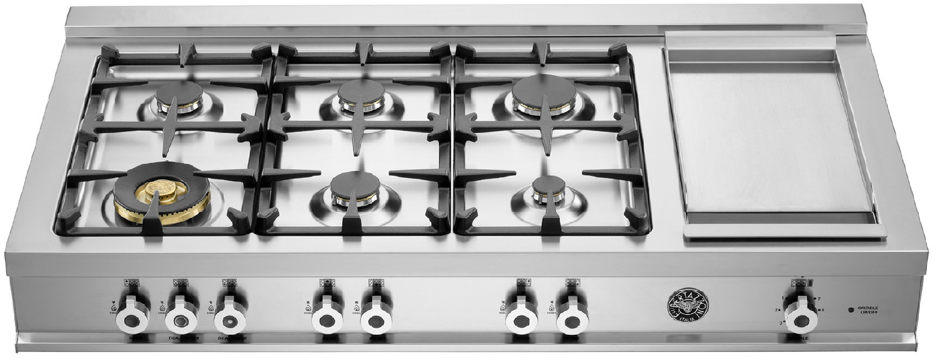 Bertazzoni rangetops and cooktops are superb cooking appliances designed, engineered and made in Italy. All Bertazzoni appliances integrate seamlessly into style-harmonized suites for a true, high-performing kitchen. Available in 5 and 6 burner configurations, Bertazzoni gas rangetops signature maintops are crafted from a single sheet of highest grade stainless steel. This proprietary design makes it very easy to clean. The dual-ring power-burner rated is at 18,000 BTUs, boiling water in under 6 minutes and simmering at an extremely low temperature. All burners are made from cast brass for enhanced performance. The stainless steel griddle with integrated cover provides additional cooking options. All Bertazzoni appliances are covered by a 2-year warranty. Products and packaging are 99% recyclable.