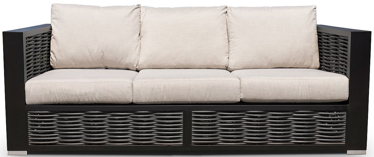Simple black aluminum frames are inset with full-round wicker panelling to blend textures. Our Chestnut Lux range features robust and classic silhouettes that are easy to style. Bring the comfort of your living room outdoors.Read More