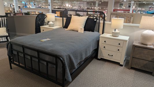 Farmhouse fresh meets industrial chic in the Harper Springs Collection. The board-and-batten construction of the signature panel bed evokes architectural details from 19th and 20th Century farmhouses, and window-pane motifs in textured glass on key pieces are inspired by the black metal windows of classic farmhouses and reclaimed factories. Black metal ferrules, corner brackets and forged iron hardware bring an industrial modern vibe to the craftsmen-like silhouettes. A black metal bed and a black mirror with window-pane border provide a dramatic contrast to the soft Silo White finish with rub-through and distressing. Harper Springs is crafted of random-width solid Pine for an authentic and casual feel. Whether you aspire to loft living or country living, the Harper Springs Collection will bring your dream home to life. Construction & Features: - bolt-on rails. - slats with support legs. - metal on whole bed. - plastic caps on headboard and footboard feet. - weight capacity: 500 lbs for specified surface area: 16” x 28”. - distributed load: test load is applied evenly distributed on the surface: 800 lbs. Box Spring Required. Headboard cannot be sold separatelyRead More