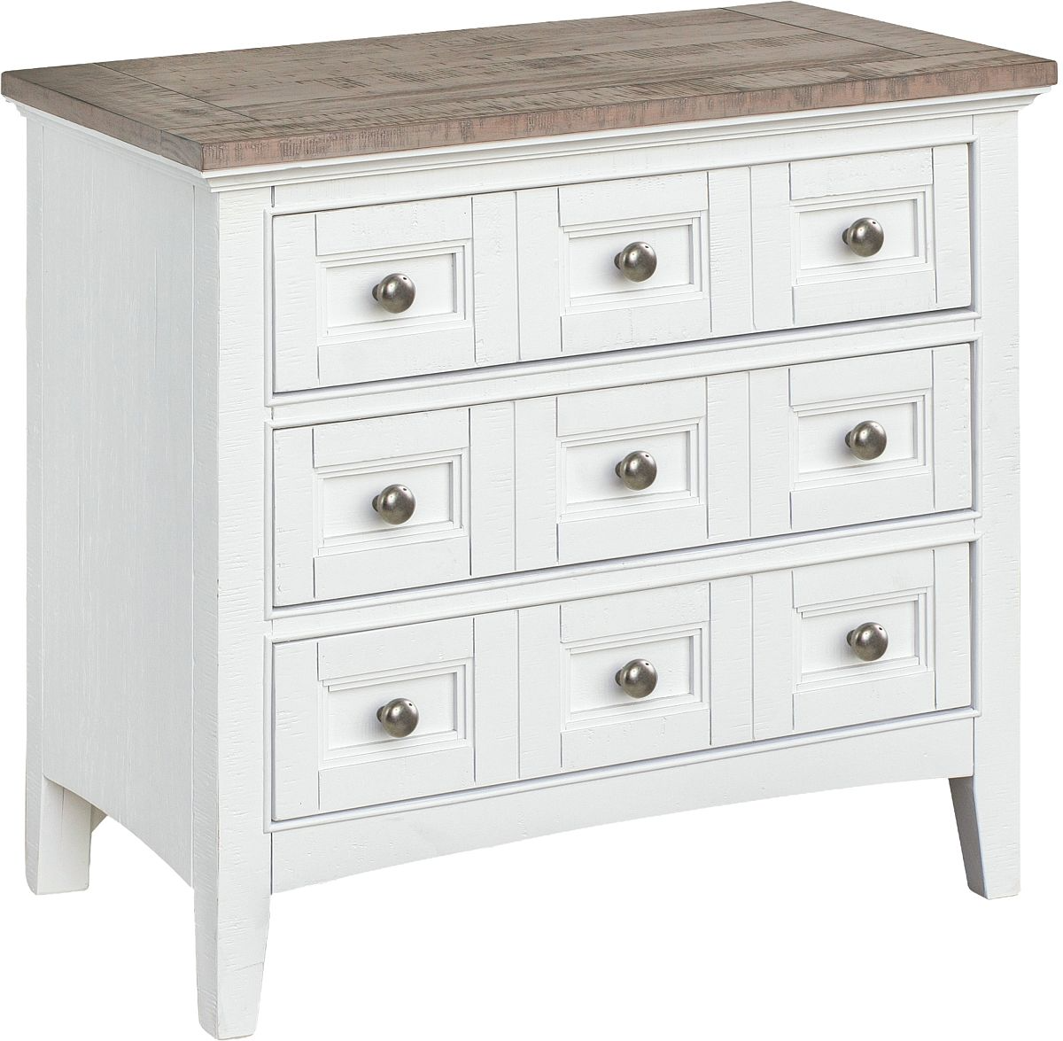 A soft chalk white finish on pine veneers and solids creates a relaxed beachy feel in any bedroom with Heron Cove. Select pieces offer a two-tone look with dovetail grey tops. A high back beaded framed panel bed lends shaker appeal and is available with hidden rails storage.Read More