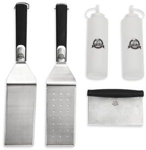 Content includes 2 Griddle spatulas, 1 Griddle scraper, and 2 plastic bottles for sauces Soft-Touch handles.