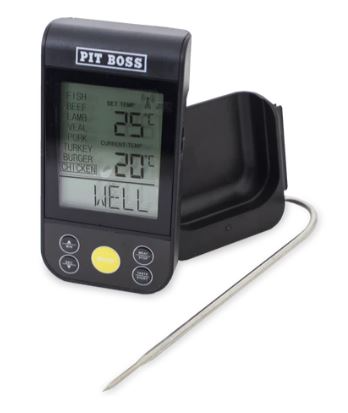 Wireless Remote BBQ Grill ThermometerIncludes wire remote and meat probeEasy SetupNo synchronization or pairing required.Programmed with preset temperatures for beef, chicken, pork, and turkey.Instant and preciseLED readoutRemote monitoring from up to 300 ft away. Pit Boss® Digital Wireless Thermometer is the smart choice for remotely monitoring your grill or smoker. The days of babysitting temperatures are over. Our thermometer is convenient to use and allows you to monitor your food from up to 300 feet away. With the easy to read LED screen, this thermometer provides instant temperature reads. There’s no synchronization needed. You can use the preset temperatures for chicken, beef, pork, and turkey - or program a temp of your own - and the Pit Boss Wireless Remote BBQ Grill Thermometer will automatically alarm you when your desired temperature is achieved. Bring convenience and innovation to your grill with the Pit Boss Wireless Remote BBQ Grill Thermometer.Read More