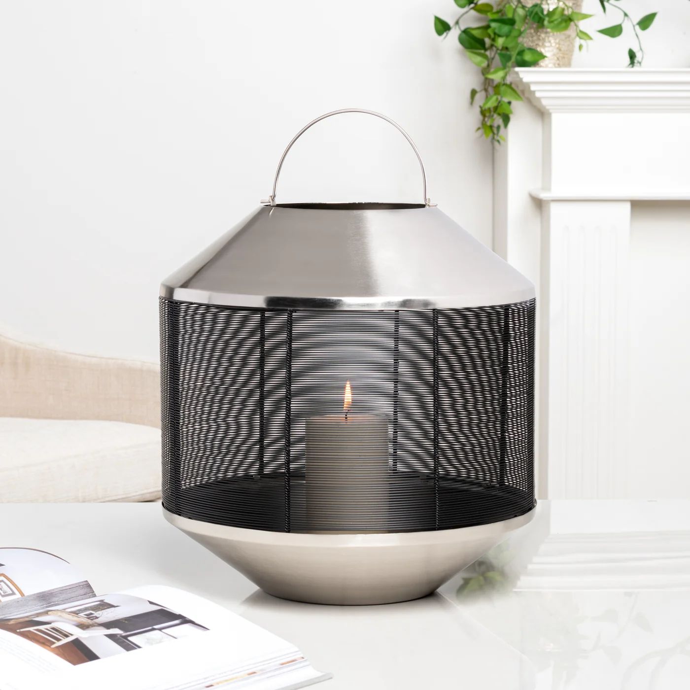 Make a modern statement with this industrial-inspired metal lantern. The conical shape is highlighted with a brushed nickel finish and pairs beautifully with the matte black wire column. Place this on a console table or hearth in the living room, or place in the front entry for a welcoming look. The size makes this great for either tabletop display on a larger surface, or as a floor lantern. Fits maximum 5.5" diameter candle. Handle height. 3.5"Read More