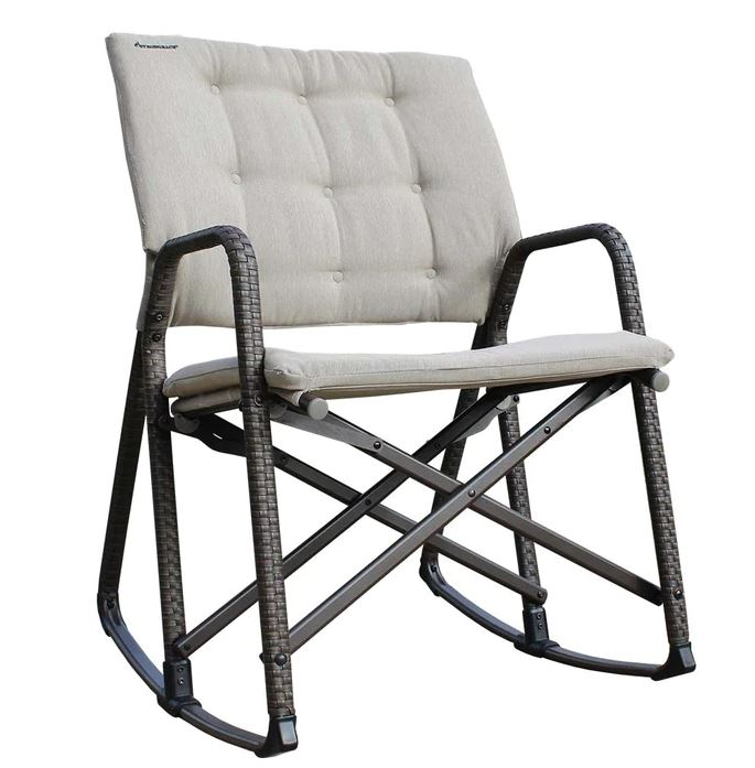 This durable wide patio rocking chair has a reinforced frame that supports up to 300lbs making this rocker an unprecedented comfort experience that allows you to achieve a continuous deep or light rock without constant pushing compared to other outdoor folding rocking chairs. The high-tech magnesium alloy frame is wrapped in attractive wicker covering along with reinforced rivets that improve patio chair stability and opening and closing mechanism longevity. The thick generous cushions are covered with a soft Olefin fabric that provides extra strength, colorfastness, and comfort that is resistant to water-based staining, abrasion, and sunlight making this the perfect addition to your patio furniture collection. Extra-plush cushions provide a soft luxurious feel and, in combination with an ergonomic seat design to prevent leg pinch while aligning the hips and back providing maximum comfort. Easy to fold and lightweight for easy storage or transport making this the perfect foldable patio chair. No assembly required. One colour option: Tan (pictured)Read More