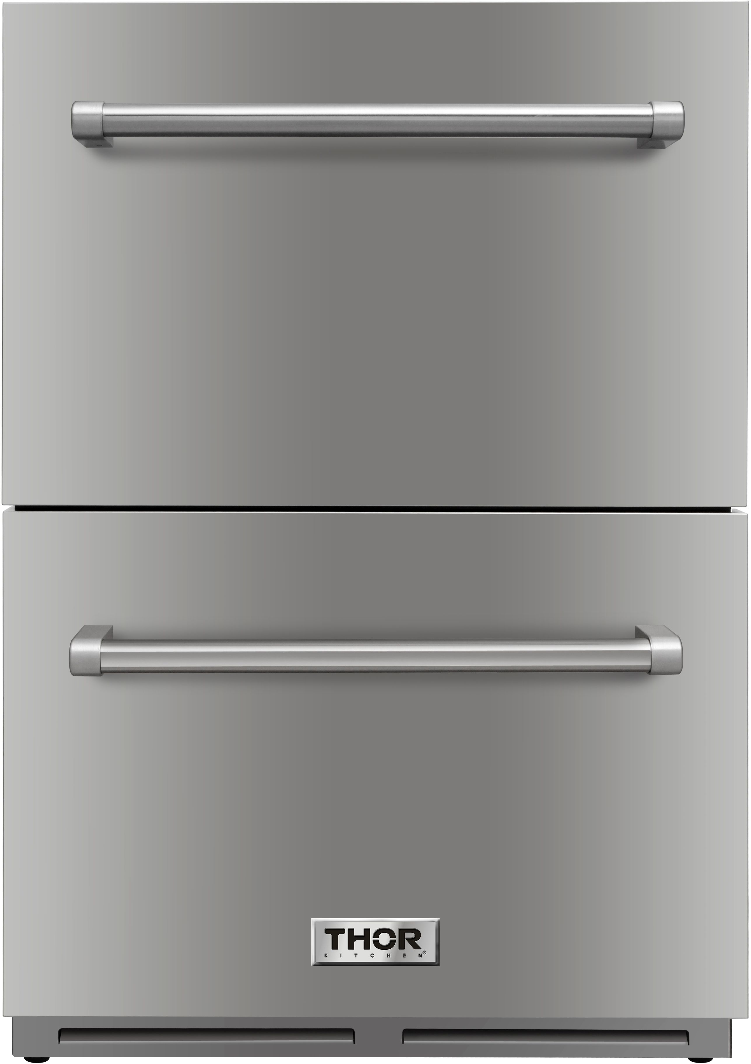 The 24-inch indoor/outdoor undercounter refrigerator in stainless steel featuring a double drawer design, digital touch pad control with blue LED display, bright white LED lighting for both drawers, and anti-fingerprint.Read More