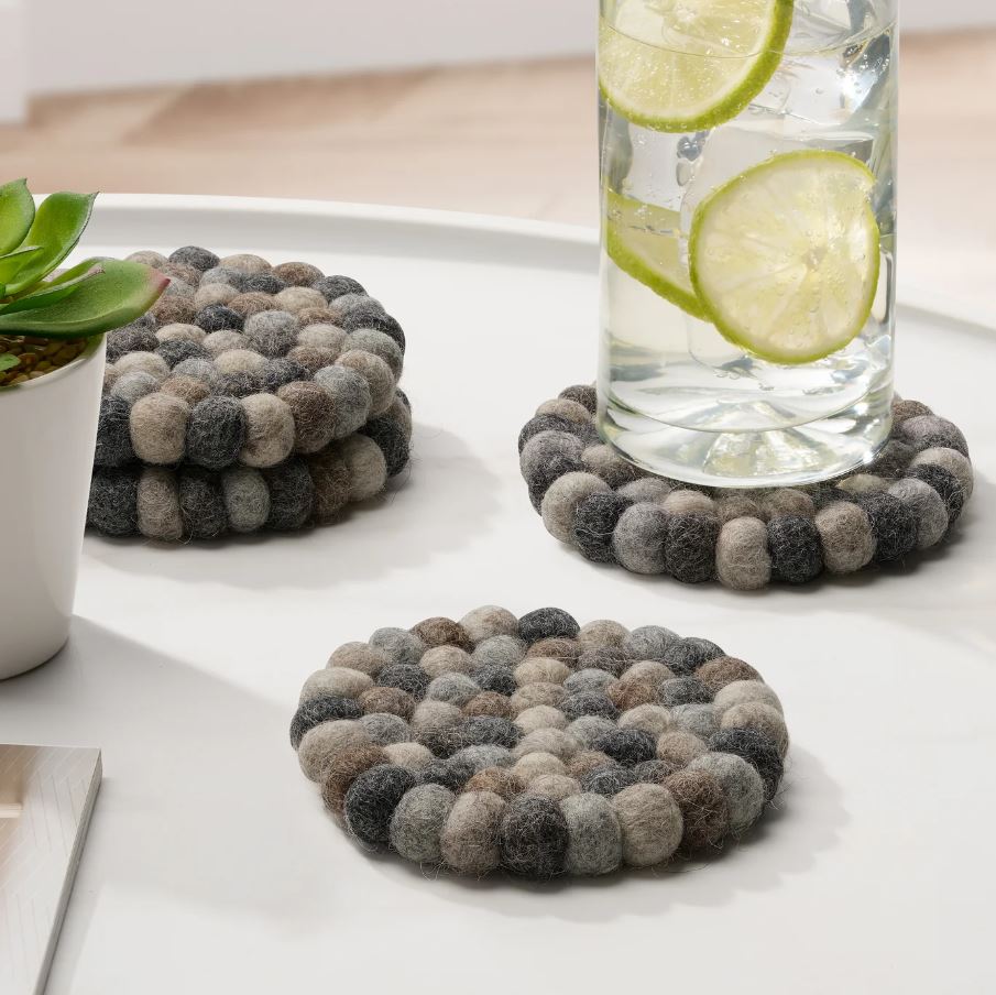 Elevate your table decor with our delightful set of four round MODWOOL coasters made from multi-colored wool felt balls. Each coaster is meticulously handcrafted from New Zealand Wool, showcasing a harmonious blend of vibrant hues that will bring a touch of whimsy to your living space. Not only do these MODWOOL coasters protect your surfaces from water rings and heat, but they also serve as charming decorative accents that effortlessly add a playful and cozy vibe to any setting.Read More